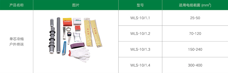 10KV單芯冷縮電纜終端附件適用于3.6/6、6/10、8.7/10、8.7/15kV單芯聚乙烯和交聯聚乙烯電力電纜。采用液態硅橡膠制造,集防水、應力控制、屏蔽、絕緣于一體。具有良好的電氣性能和機械性能,能在各種惡劣的環境條件下長期使用。具有重量輕、安裝方便等優點。廣泛地應用于電力、石油、化工、冶金、鐵路、港口和建筑等各個領域。
