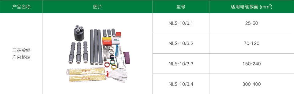 10KV三芯冷縮電纜附件系列產(chǎn)品,適用于3.6/6、6/10、8.7/10、8.7/15kV三芯聚乙烯和交聯(lián)聚乙烯電力電纜。采用液態(tài)硅橡膠制造,集防水、應(yīng)力控制、屏蔽、絕緣于一體。具有良好的電氣性能和機(jī)械性能,能在各種惡劣的環(huán)境條件下長期使用。具有重量輕、安裝方便等優(yōu)點(diǎn)。廣泛地應(yīng)用于電力、石油、化工、冶金、鐵路、港口和建筑等各個(gè)領(lǐng)域。