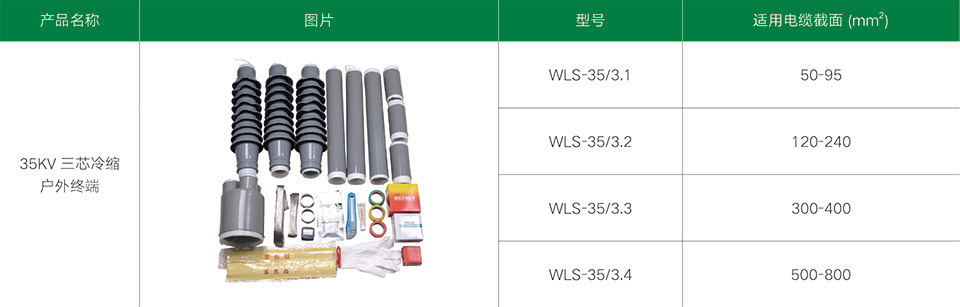 35kV三芯冷縮電纜附件系列產(chǎn)品,適用于21/35、26/35kV三芯聚乙烯和交聯(lián)聚乙烯電力電纜。冷縮電纜附件采用進(jìn)口液態(tài)硅橡膠材料制造而成,不但具有十分優(yōu)良的電氣性能,而且還具有優(yōu)異的憎水性、高彈性、使用壽命長及恒定的收縮壓力等物理特性。采用冷縮電纜附件,無需明火及特殊工具,只需輕輕抽取塑料支撐條即可,就能自動(dòng)收縮復(fù)位,安裝非常方便于工作。具有良好的電氣性能和機(jī)械性能,能在各種惡劣的環(huán)境條件下長期使用。具有重量輕、安裝方便等優(yōu)點(diǎn)。廣泛地應(yīng)用于電力、石油、化工、冶金、鐵路、港口和建筑各個(gè)領(lǐng)域。