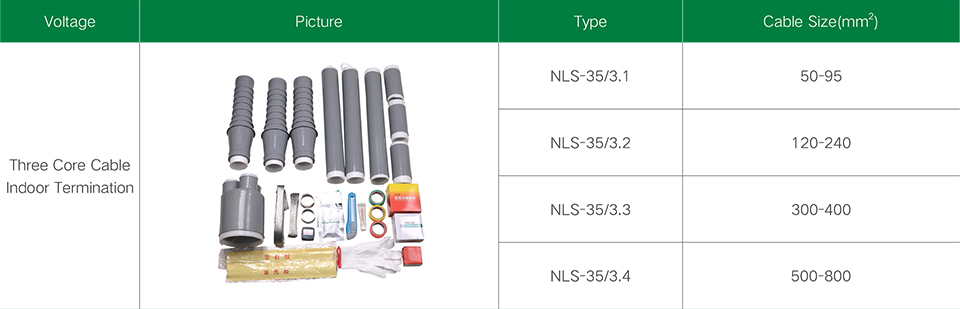 35kV three-core cold shrinkable cable accessories series for 21/35, 26/35kV three-core polyethylene and cross-linked polyethylene power cables. Cold shrinkable cable accessories are made of imported liquid silicone rubber materials, which not only have very good electrical properties, but also have excellent physical characteristics such as water repellency, high elasticity, long service life and constant shrinkage pressure. Using cold shrinkable cable accessories, no need for open flame and special tools, just gently extract the plastic support strip, can automatically shrink and reset, installation is very convenient for work. It has good electrical and mechanical properties and can be used for a long time under various harsh environmental conditions. It has the advantages of light weight and easy installation. It is widely used in electric power, petroleum, chemical industry, metallurgy, railway, port and construction fields.