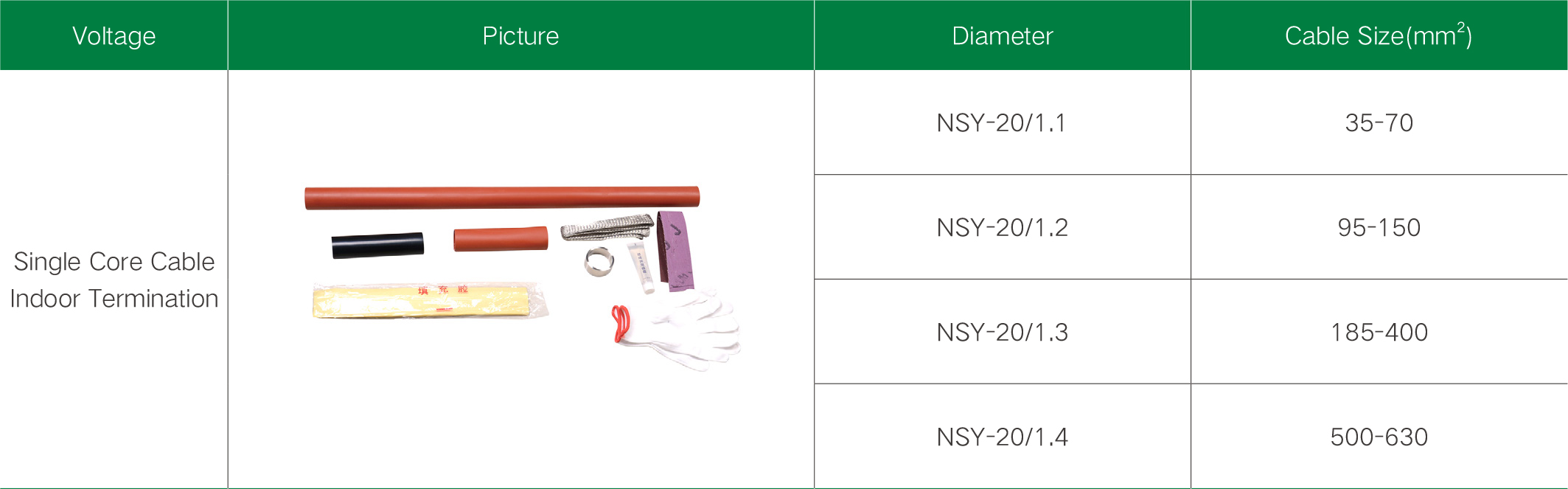 The 20KV single-core heat shrinkable cable termination accessory can be used to connect the power distribution system inside the building and the power supply network outside, providing safe and reliable power connection and insulation protection.