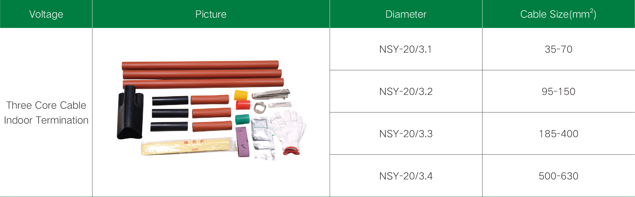 20KV three-core heat shrinkable cable termination accessory is a kind of terminal connection and insulation protection equipment for high-voltage (20kV) three-core power cable. It is suitable for the terminal part of three-core power cable, is used to connect cables with equipment or power distribution systems, and provides reliable cable insulation and connection performance. 20KV single-core heat shrinkable cable terminal accessories are widely used in high-voltage (20kV) power distribution systems for connecting and insulating the terminal part of single-core power cables.