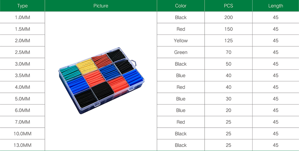 A household heat shrink tubing set is an electronic material used for insulation, repair, and protection of wires and cables in the home. It usually consists of a set of heat shrink tubing equipped with other necessary accessories to provide a simple and effective solution for wire insulation and maintenance.