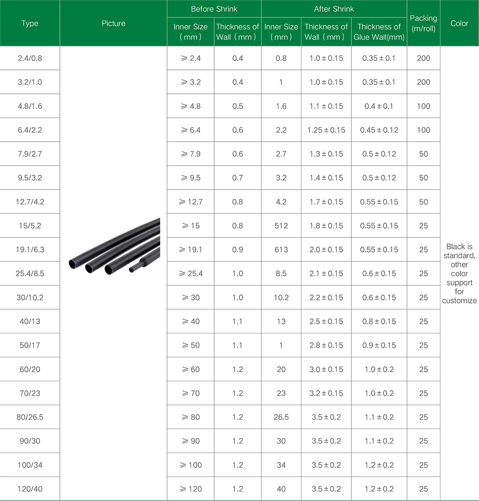 Heat shrinkable double-walled tubes provide excellent insulation and protection, effectively isolating wires and preventing current leakage. The inner layer of hot melt adhesive combines with the surface of the wire to form a reliable insulation layer to prevent external factors such as moisture, dust, and chemicals from attacking the wire. The outer material provides mechanical protection against impact, pulling and abrasion of the wires.